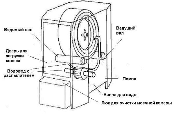 Снятые с автомобиля колеса по одному вставляются в установку. Конструктивно она выглядит как металлическая камера с дверцей для подачи/приемки колеса. Колесо внутри установки помещается вертикально на роликовых опорах.